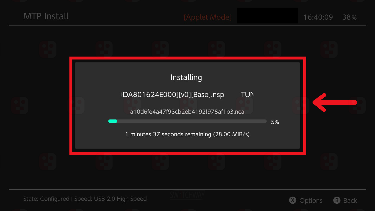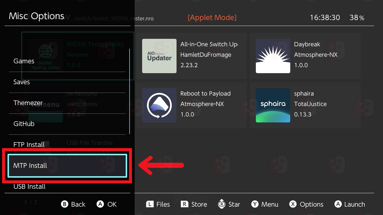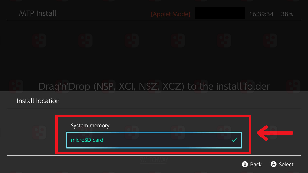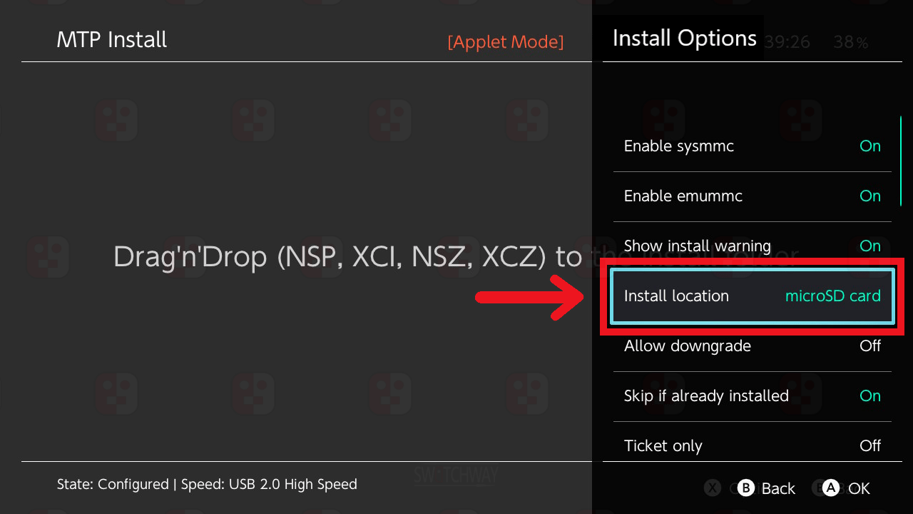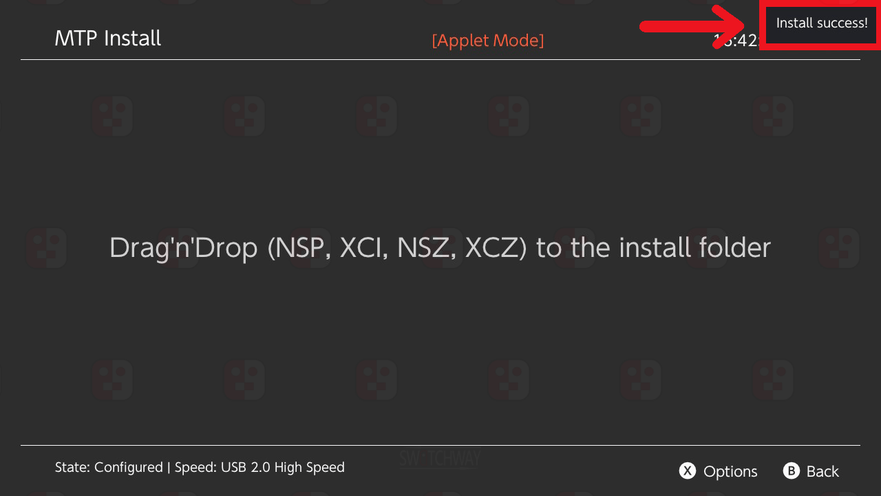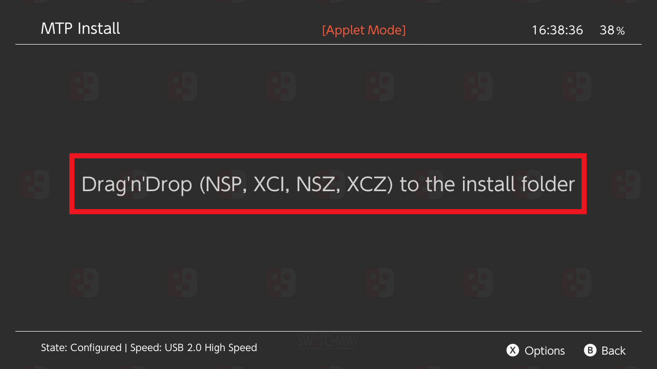 - Scroll down to MTP Install and press the A button. Your Switch will display a screen telling you to Drag’n’Drop (NSP, XCI, NSZ, XCZ) to the install folder. (Your Switch will now be connected to your PC and will show as Nintendo Switch in the file explorer on your PC.).