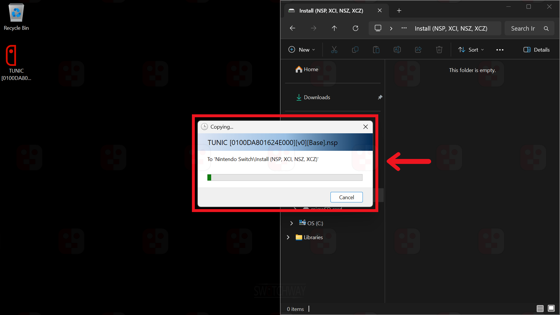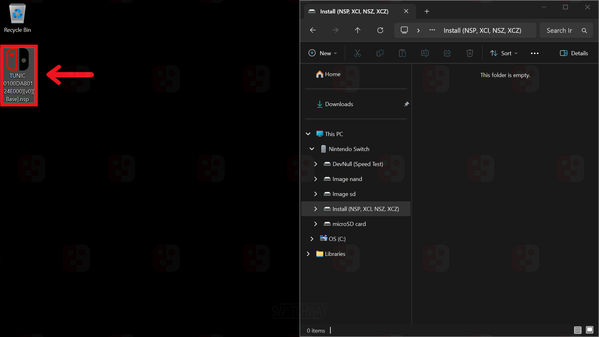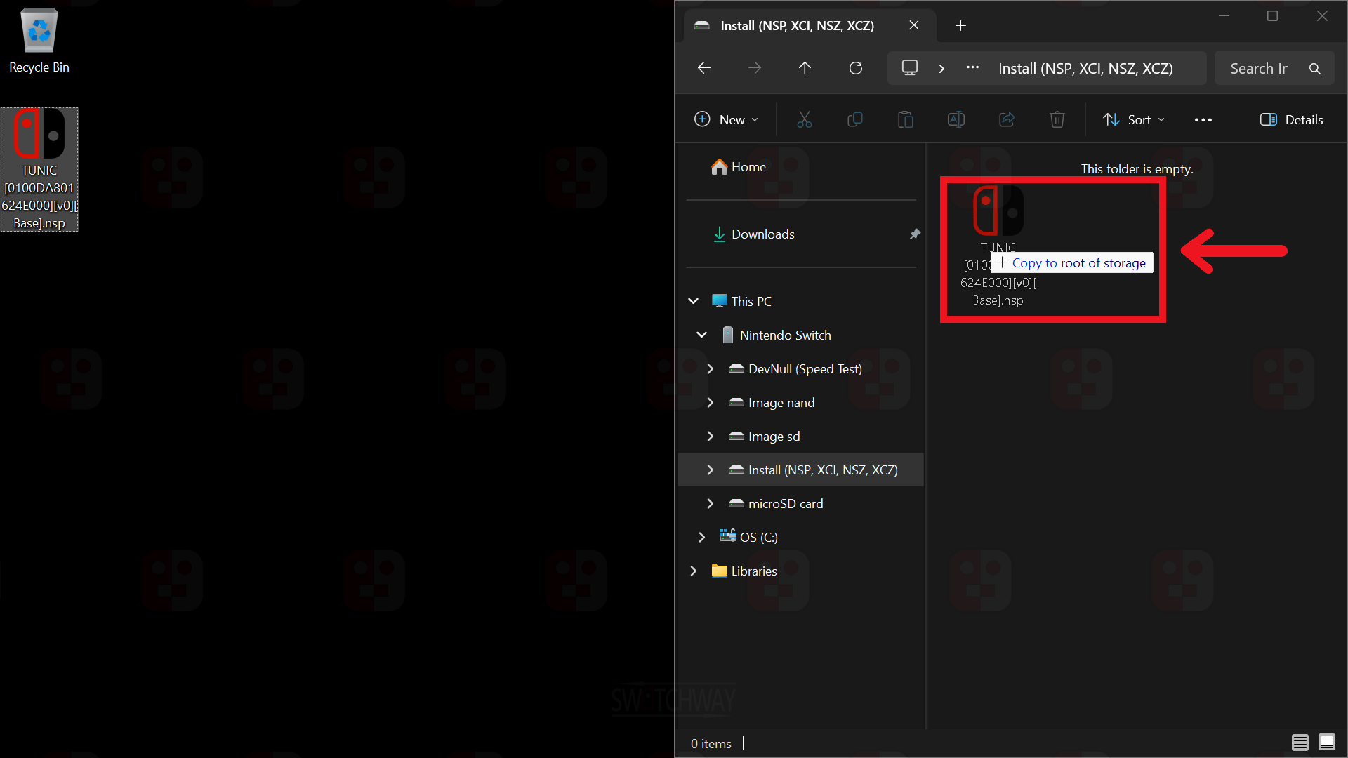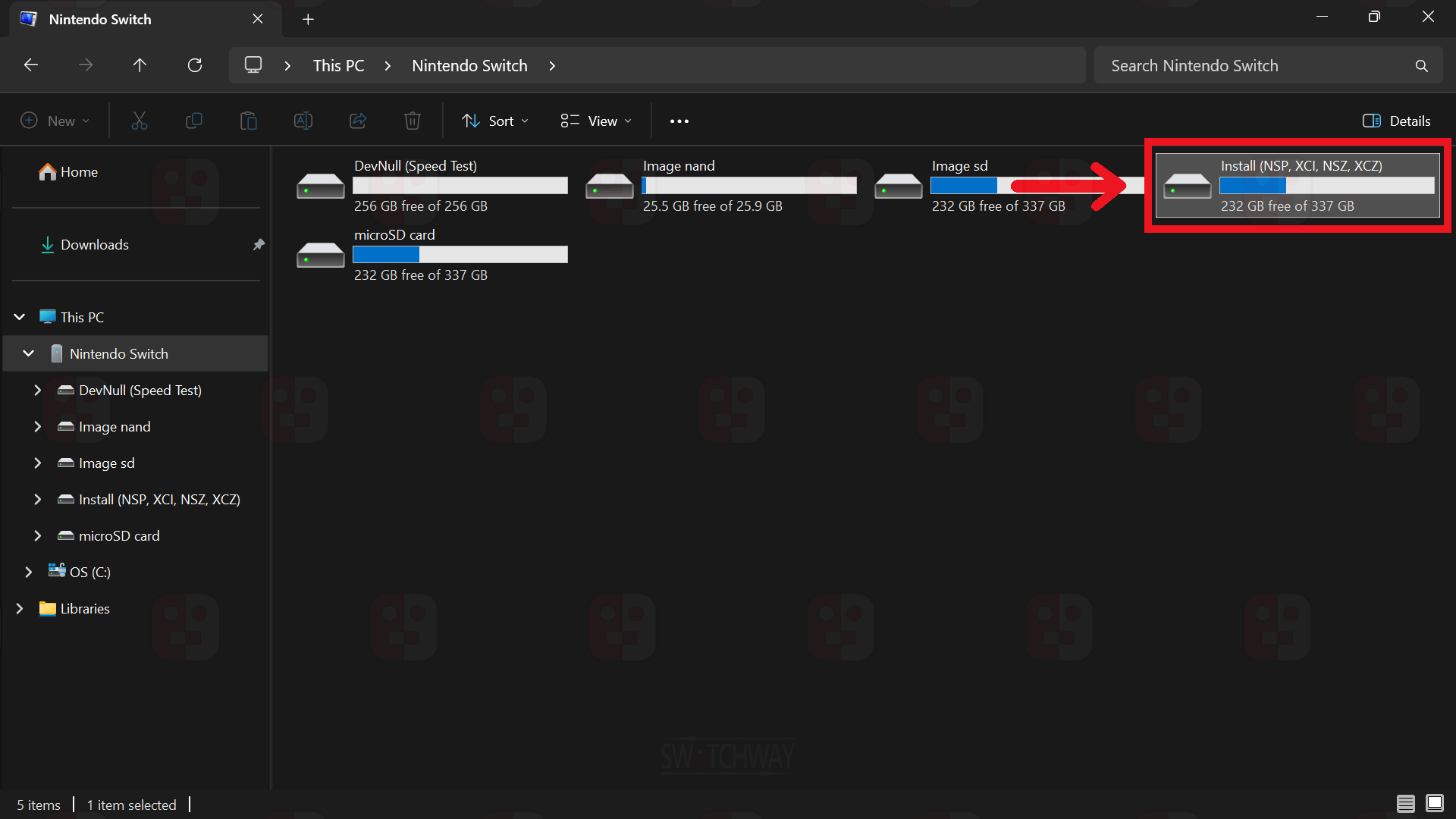 - On your PC open the Nintendo Switch > Install (NSP, XCI, NSZ, XCZ) drive and drag/drop or copy the base game, update or DLC file(s) you want to install from your PC into the Install (NSP, XCI, NSZ, XCZ) drive.