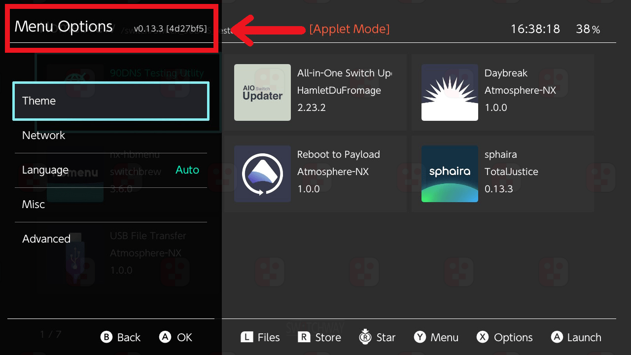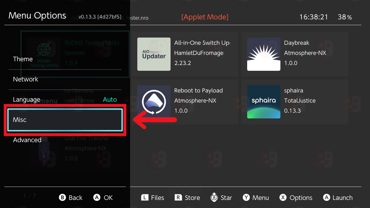 - In Sphaira, press the Y button to access the Menu Options, then scroll down to Misc and press the A button to open the Misc menu.
