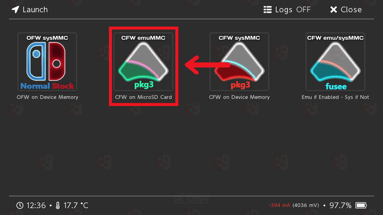 - On the Hekate home screen, select Launch > choose one of the options below: - Atmosphere CFW on emuMMC:
